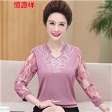 恒源祥中老年女装妈妈装长袖t恤女士针织2020秋季新款中年大码圆领纱袖上衣九分袖老年人奶奶装打底衫 7220浅紫 xL建议110--125斤